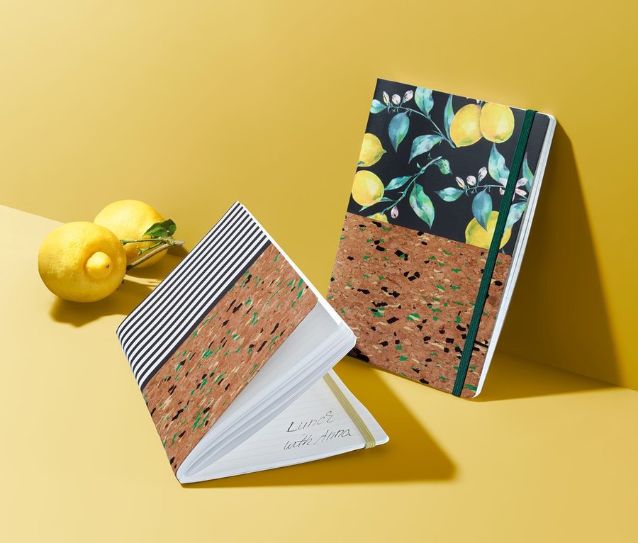 Pravý korek, krásně měkký na omak, a zaoblené rohy zajišťují krásný vzhled, zatímco papír a karton s certifikací FSC® zase dobrý pocit z ochrany životního prostředí. Bloky jsou vybavené elastickým páskem k převázání.