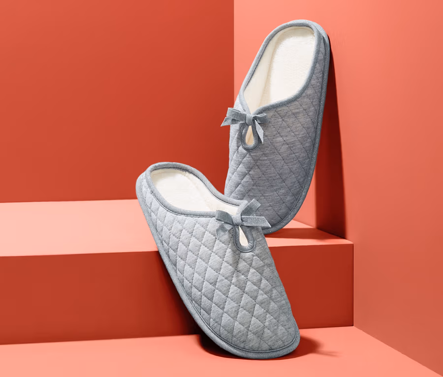 Pantofle jsou velmi pohodlné, a navíc mají dekorativní vzhled. Jsou zpracovány s prošívaným kosočtvercovým vzorem, dekorativní paspulkou a ozdobnou mašličkou.