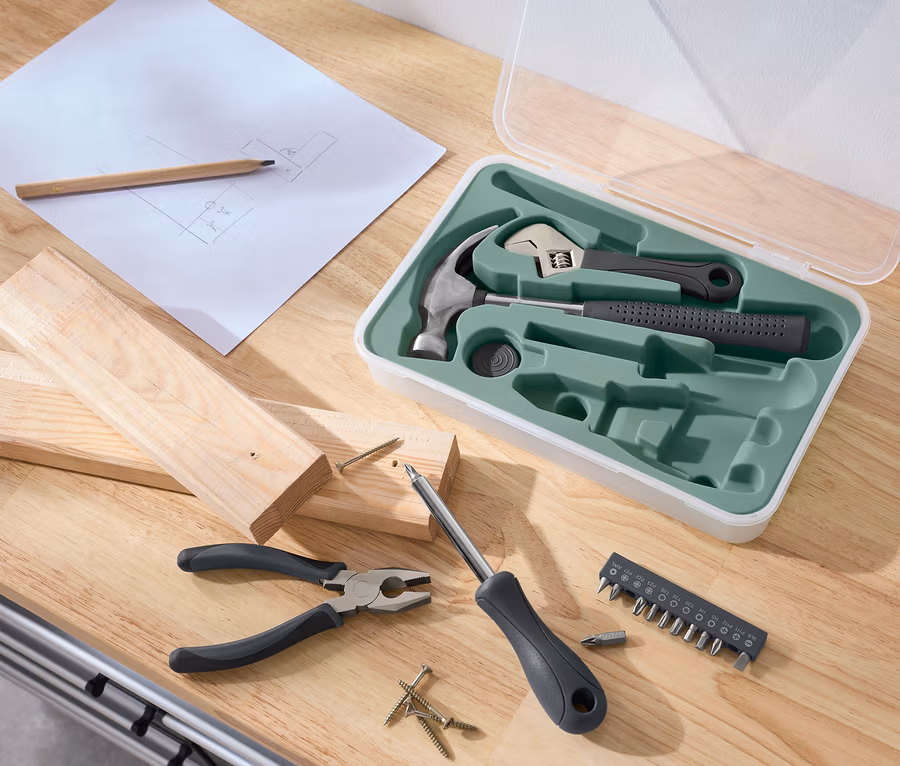 - Sada obsahuje kladivo, kleště, bitový šroubovák a 12 bitů