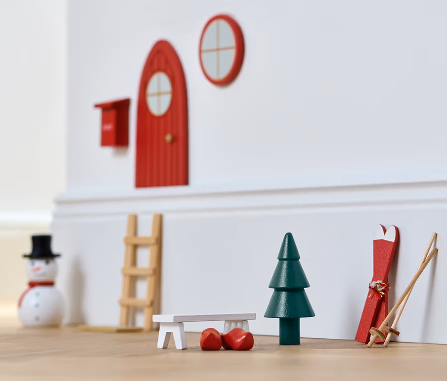 - Propracované detaily v miniaturním formátu: lyže s hůlkami, stromek, lavička a skřítkovské boty