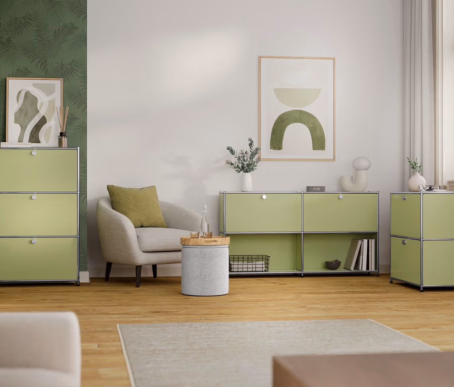 Kovová komoda »CN3« se 3 výklopnými dvířky, pistáciová