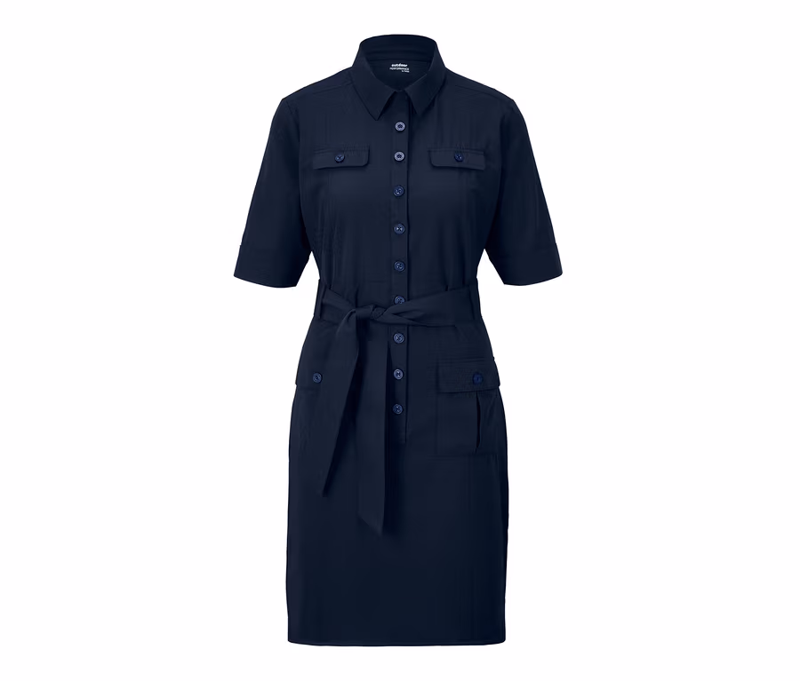 Šňůrka na zavazování v pase, obě dekorativní náprsní patentní kapsy a dvě nakládané kapsy dodávají šatům ležérní safari vzhled. Šaty mají límec, 3/4 knoflíkovou légu a polodlouhé rukávy. Spodní lem je mírně zaoblený.