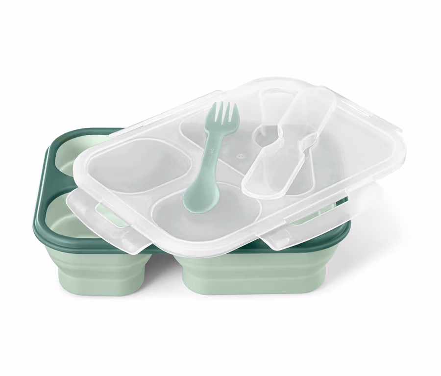 Tato dóza na oběd nabízí tři různě velké přihrádky, v nichž můžete přenášet různé druhy svačin, toppingů či dresingů. Průhledné víko je opatřené zaklapovacími uzávěry pro snadné otvírání a zavírání dózy. Navíc lze do víka uložit kombinaci vidličky a lžíce – ideální na výlet, do školy či do kanceláře. Pokud dózu právě nepotřebujete, můžete ji naplocho složit a prostorově úsporně uschovat.