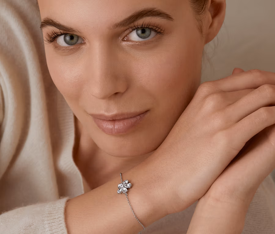 Náramek, rhodiovaný, s květem ze skleněných kamínků