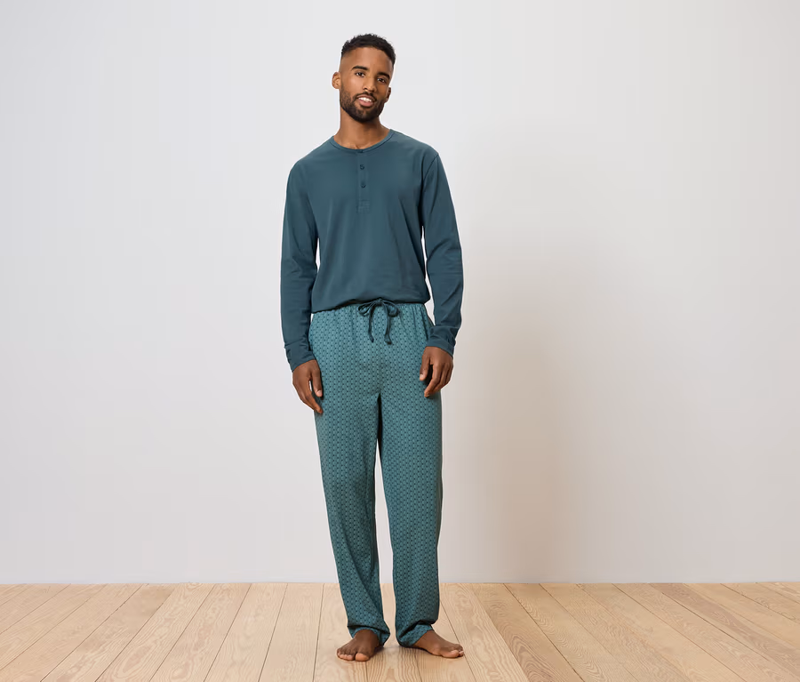 Kalhoty: celoplošný potisk v nefritové a petrolejové barvě