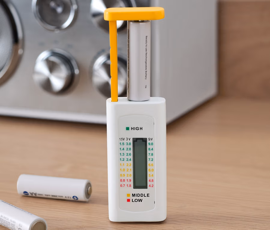 - Vhodný pro běžné typy baterií, baterie a akumulátory: typ AAA, AA, C, D, knoflíkové baterie 1,2 V, 1,5 V, 3 V a blokové baterie 9 V