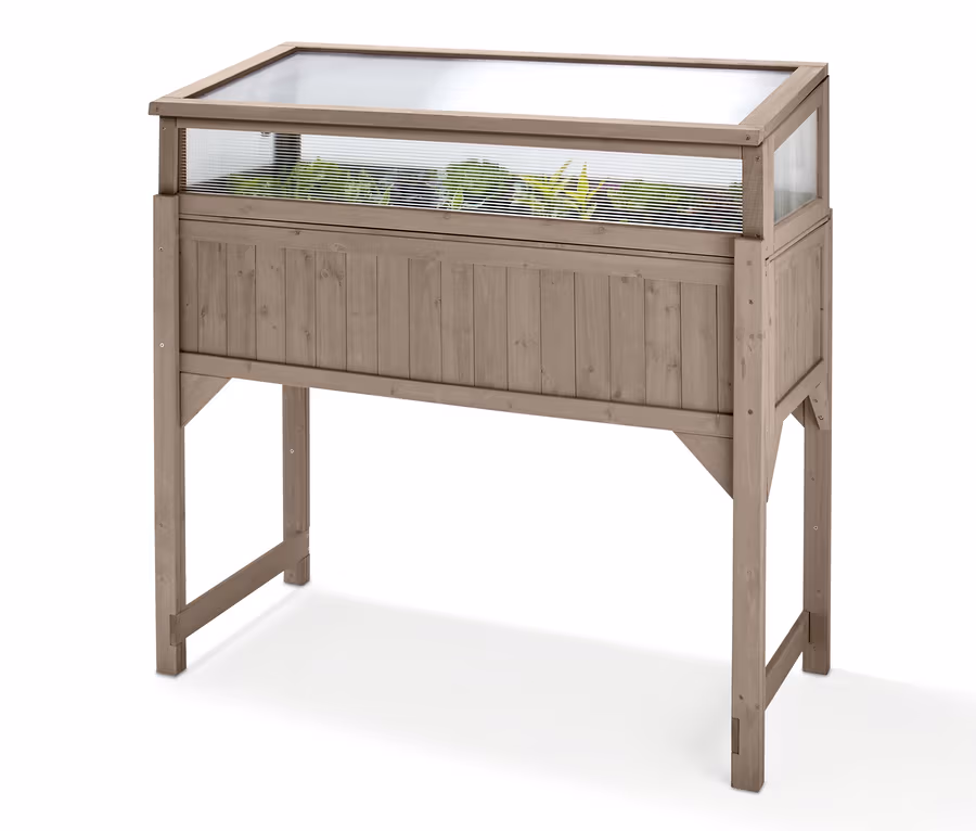 Vysoký truhlík z impregnovaného masivního dřeva odolného proti povětrnostním vlivům je vybaven odnímatelným skleníkovým nástavcem na předpěstování. Průhledné víko se dá zavírat na dva háčky nebo může díky zaklapovacím závěsům zůstat otevřené. Díky tomu lze optimálně využívat sluneční světlo. Dno má lehký spád, který brání hromadění vody.