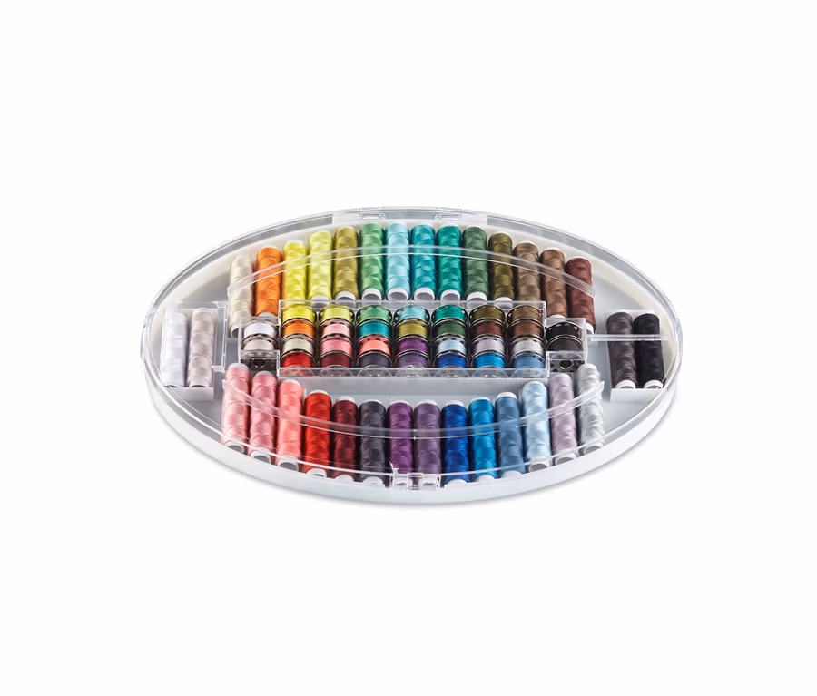 - Včetně úložného boxu, 32 cívek šicích nití a 32 cívek spodních nití