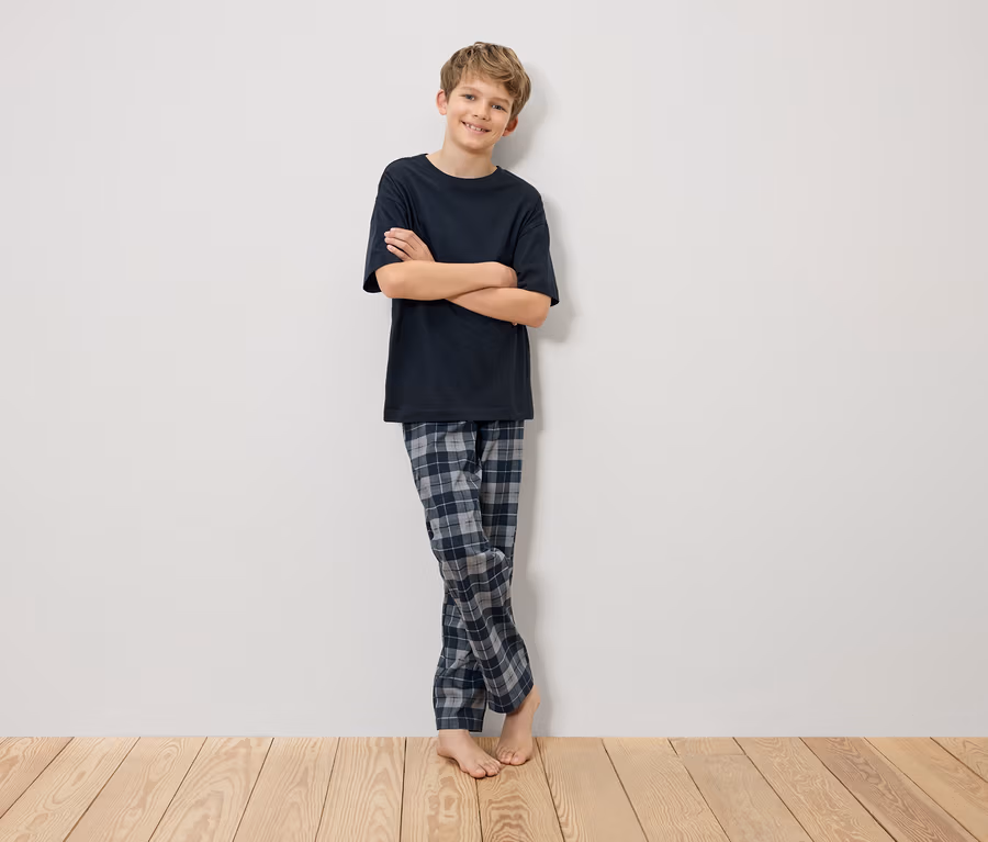- 1x horní díl: tmavě modrá, kalhoty: kostkovaný vzor v různých barvách