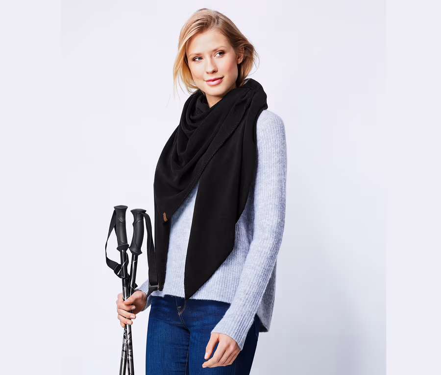 Tato fleecová šála je obzvlášť měkká, lehká a navíc nádherně hřejivá. Trojcípý tvar s řetízkovým stehem a detail v koženém vzhledu zajistí, že se šála stane Vaším oblíbeným doplňkem, který se hodí ke každému outfitu.