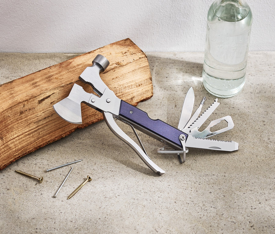 • 11 funkcí: sekerka, kladívko, nůž s hladkým ostřím, kleště, pilník, pilka na dřevo, pilka, křížový šroubovák, plochý šroubovák, klíče (6, 7, 8, 10 mm) a otvírák na láhve