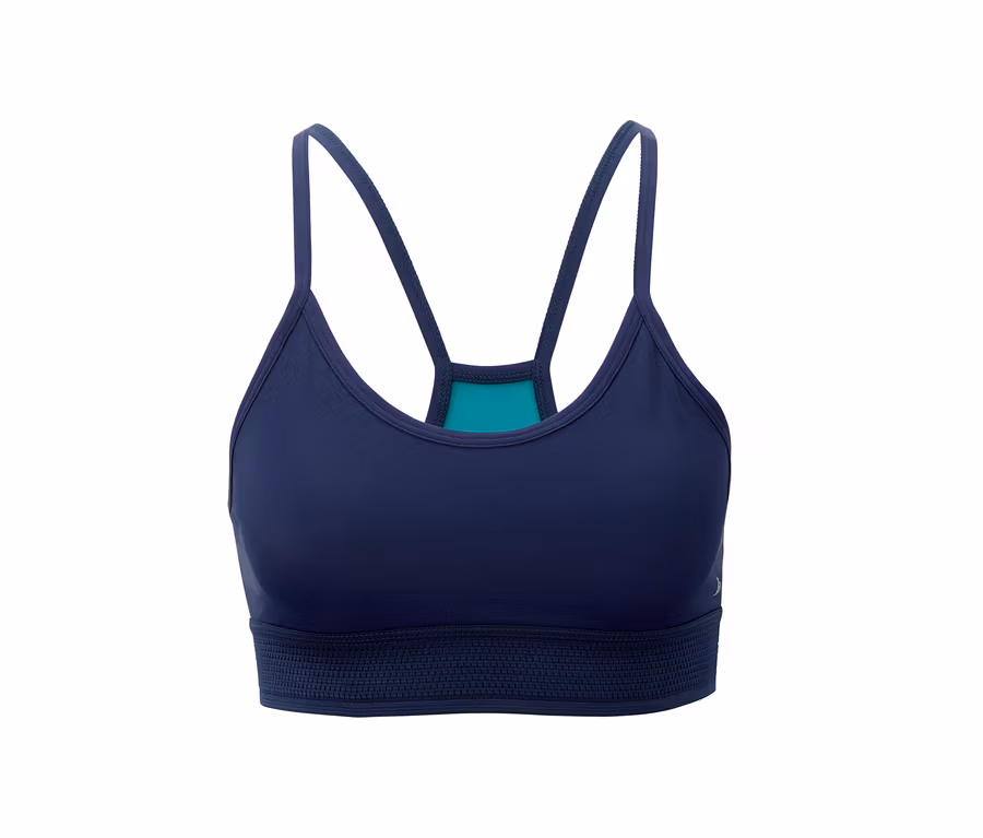 Perfektní opora při sportu: tato sportovní podprsenka je ideální volbou na trénink. Má dvouvrstvé zpracování na přední straně, elastickou gumu pod prsy a je z materiálu s inovativním vláknem ECONYL® – materiálu, který se kompletně získává z recyklovaného polyamidu. Tento sportovní kousek oděvu navíc díky obsahu elastanu dobře drží tvar, perfektně sedí a přitom poskytuje úplnou volnost pohybu. Má vykrojená záda a silnou síťovinu na zadním dílu.