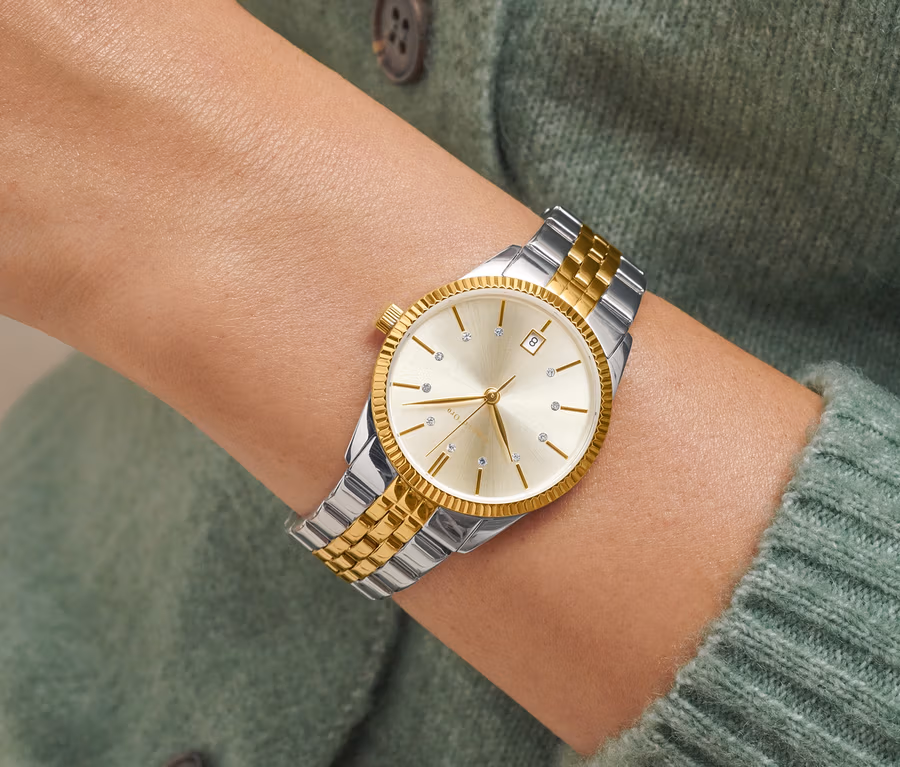 Dámské hodinky ve stříbrno-zlaté kombinaci s datumem