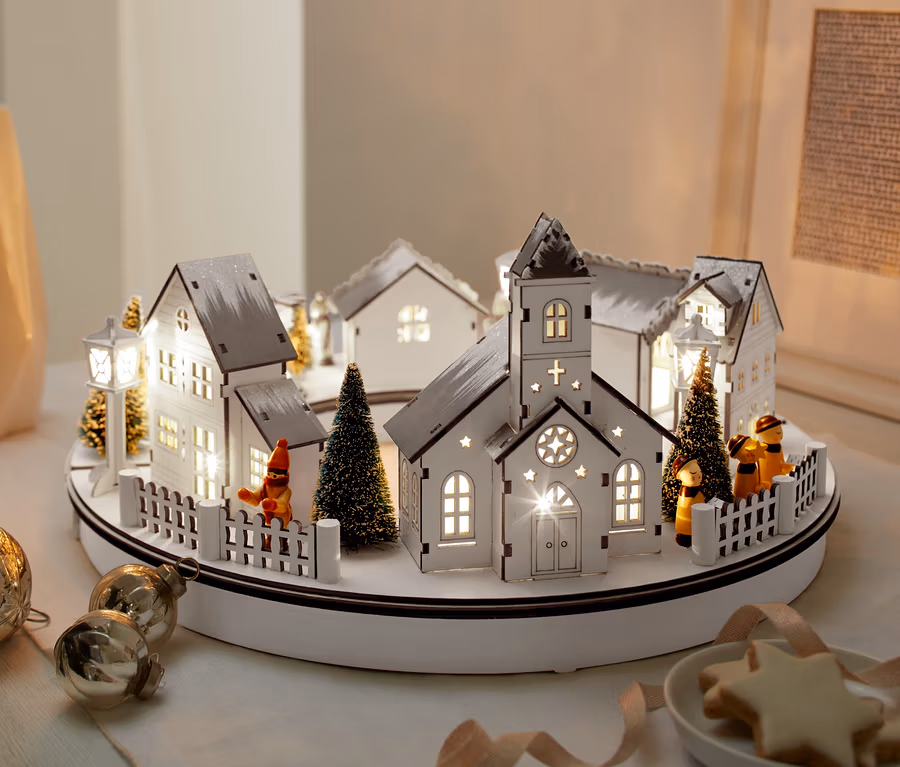 Tato příjemná dekorace je ideální na vánoční výzdobu. Dřevěná vesnička s LED upoutá každý pohled, a navíc zajistí útulnou atmosféru! Sestává ze dvou dřevěných půlkruhů, které jsou osazeny celkem 16 LED vydávajícími teplé bílé světlo. Díky konstrukci lze model postavit různými způsoby. S jednou sadou baterií vydrží svítit asi 230 hodin. Funkce časovače zajišťuje úsporu energie: osvětlení se po šesti hodinách automaticky vypne a po dalších 18 hodinách se opět zapne.