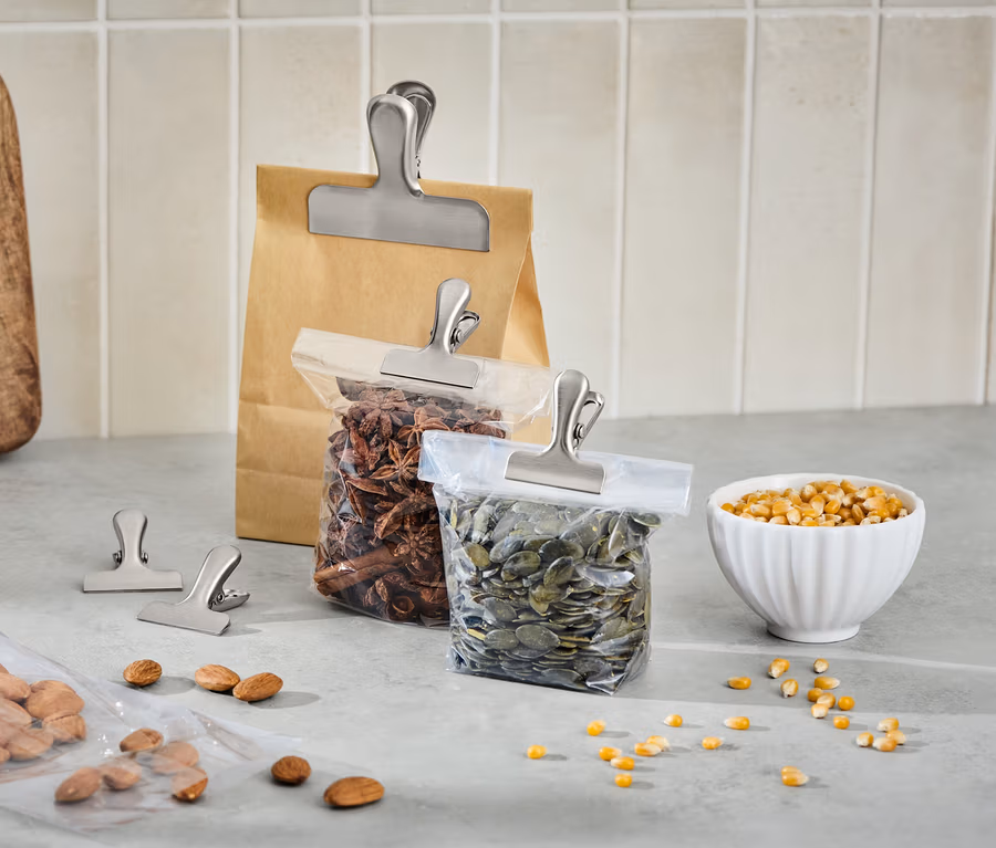 - K opětovnému uzavírání načatých sáčků s kořením, zamrazovacích sáčků apod.