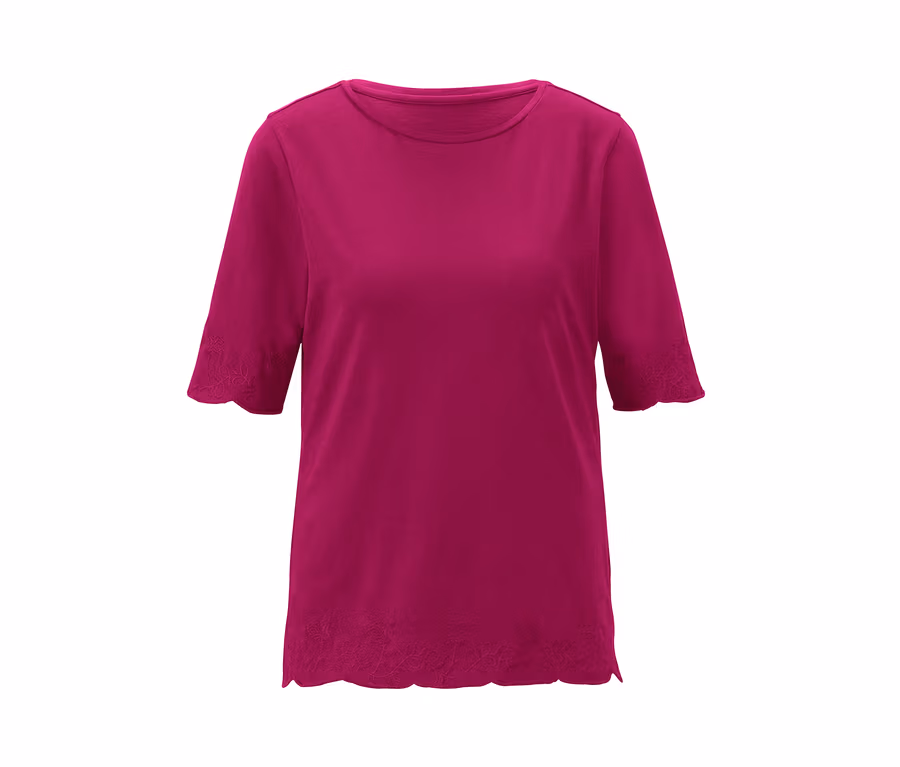 Triček není nikdy dost – zejména když jsou v trendy bobulové barvě a zdobí je dekorativní květinová výšivka. Vlnkový lem na koncích rukávů a spodním lemu dodává tričku dodatečný individuální akcent. Letně působící, příjemný vršek má lehký lodičkový výstřih, boční rozparky na spodním lemu a polodlouhé rukávy. Tričko vyrobené z materiálu s vysokým podílem bavlny je velmi příjemné na tělo a zaručuje vysoký komfort nošení v horkých dnech.