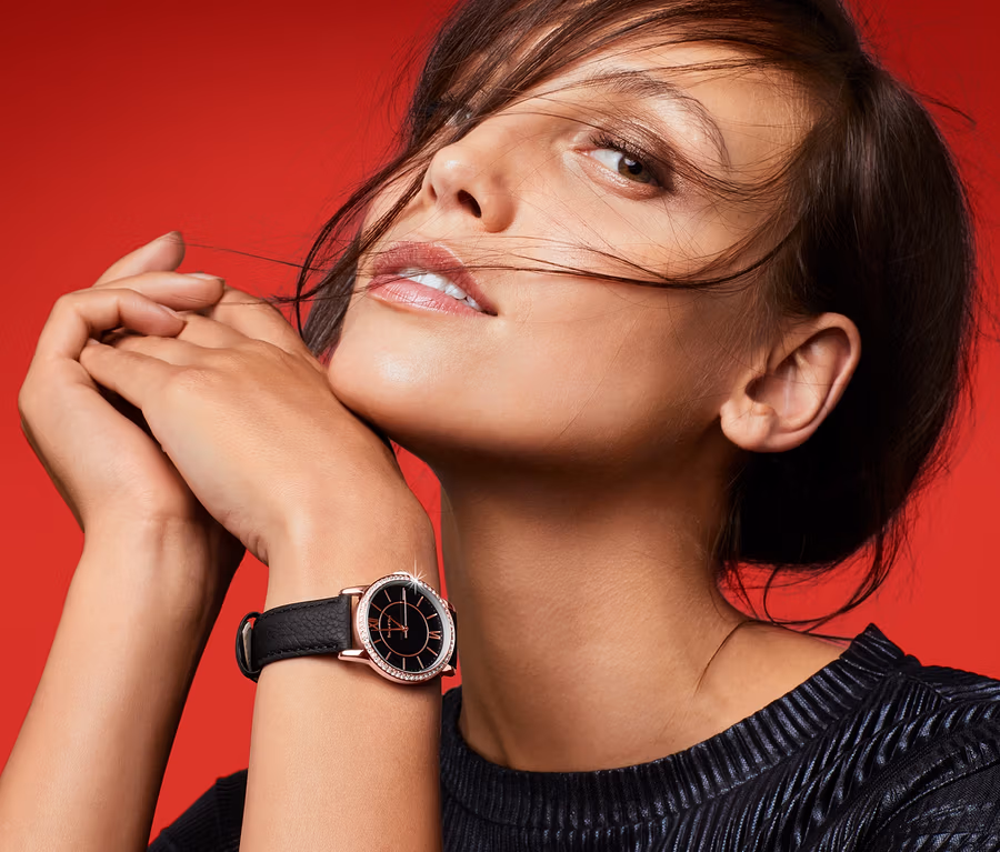 - Pouzdro, dno, přezka a korunka: ušlechtilá ocel, pozlacená růžovým zlatem