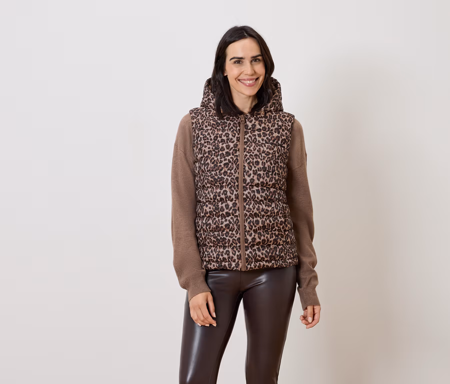 Prošívaná vesta s kapucí, béžová s celoplošným leopardím potiskem v hnědé a černé barvě
