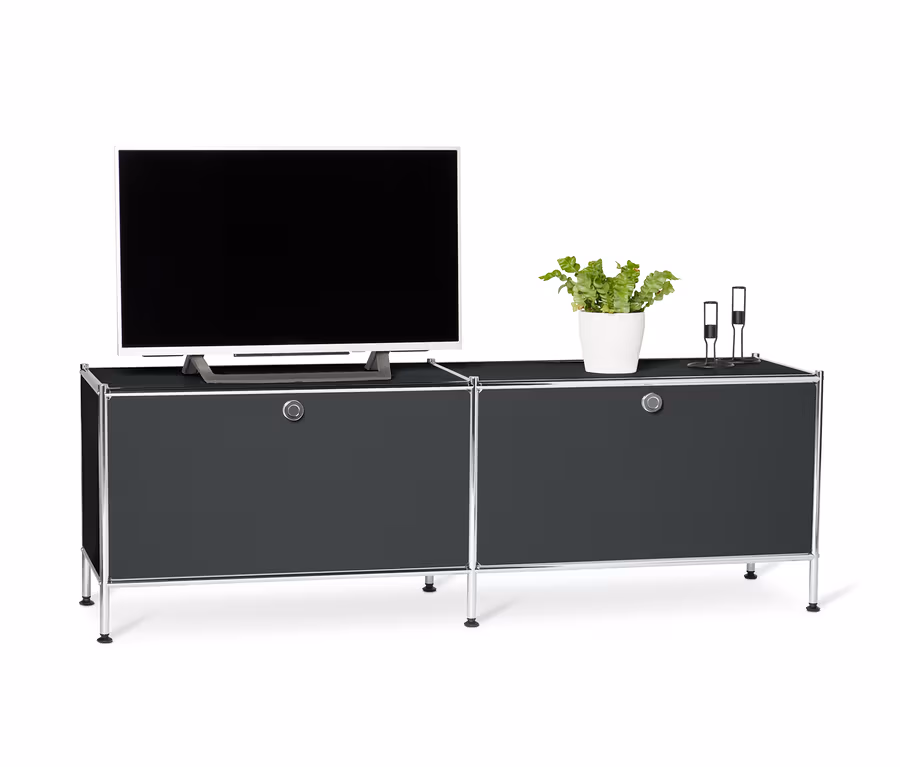 - Nízká skříňka s chromovanými nohami a výškově nastavitelnými plastovými nožkami, které zajišťují bezpečnou stabilitu i na nerovném povrchu
