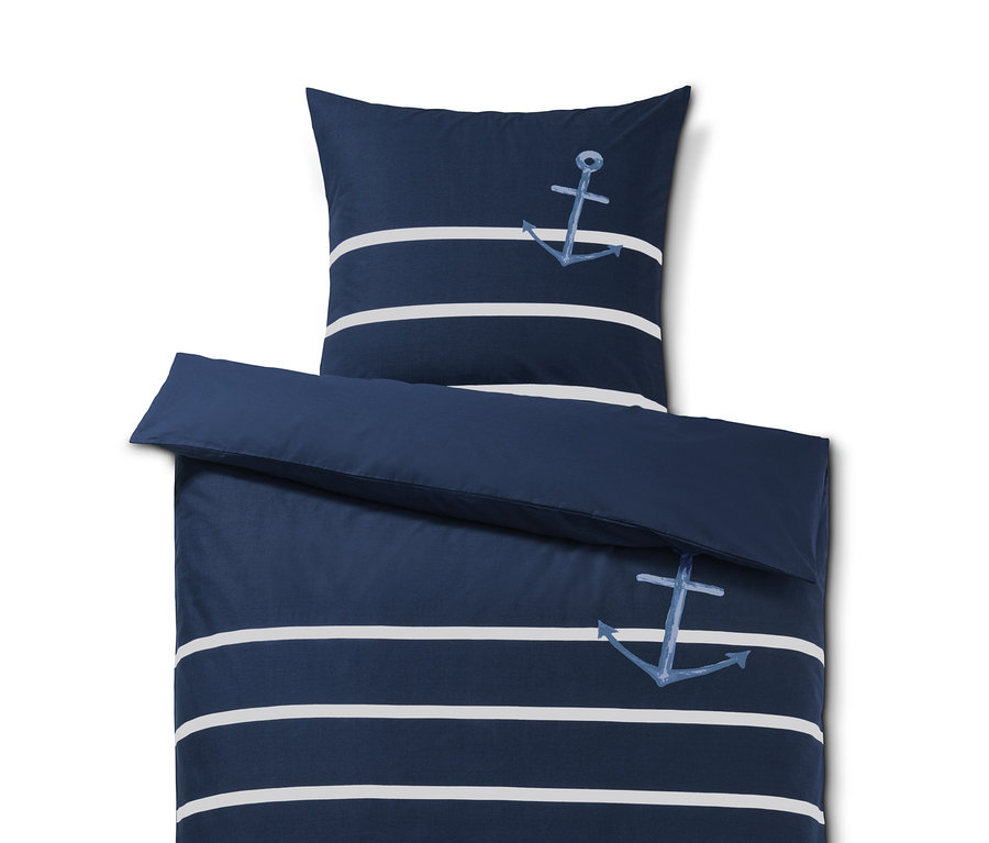 - 1 strana tmavě modrá s bílými proužky a potiskem kotvy, 1 strana tmavě modrá