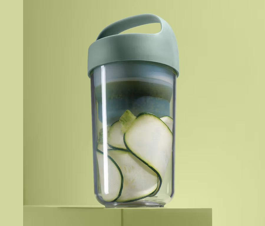 A pokud jde o sucho: dóza 100% těsní, takže je kromě pevných pokrmů, jako je např. salát, vhodná i na tekuté potraviny, jako je jogurt nebo polévka. Dóza má objem cca 600 ml. Skládací silikonovou vložku lze v případě potřeby rozložit na dvojnásobnou velikost.