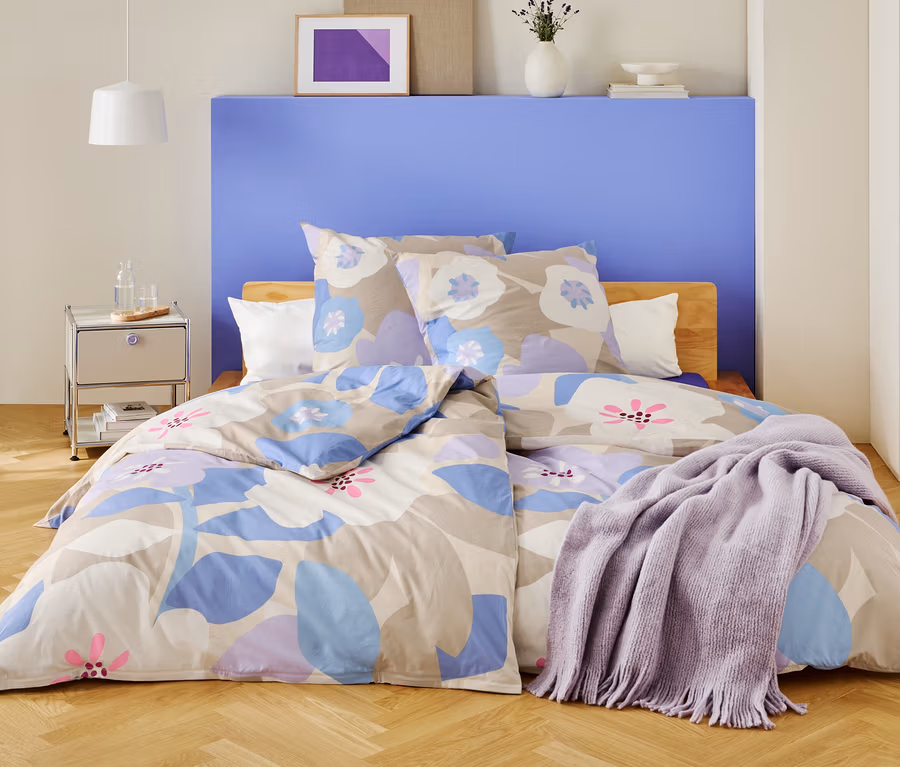 Béžová s celoplošným květinovým potiskem ve fialové a modré barvě