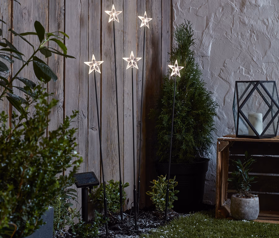 - 5 světelných zápichů s LED hvězdičkami ve 2 různých výškách: 3× cca 83,5 cm, 2× cca 104 cm