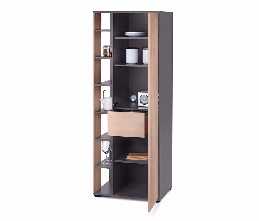 Úložného prostoru není nikdy dost – a tato velká víceúčelová skříň z naší série úklidového nábytku a zařízení do domácnosti toho může rozhodně hodně nabídnout. Dvířka jsou opatřená kováním se zaklapovacím mechanismem, takže se dají namontovat obratem ruky. Za dvířky se nacházejí dvě pevné police, tři vkládací police nastavitelné do 5 výšek a prostorná zásuvka se snadno pohyblivými kovovými výsuvy.