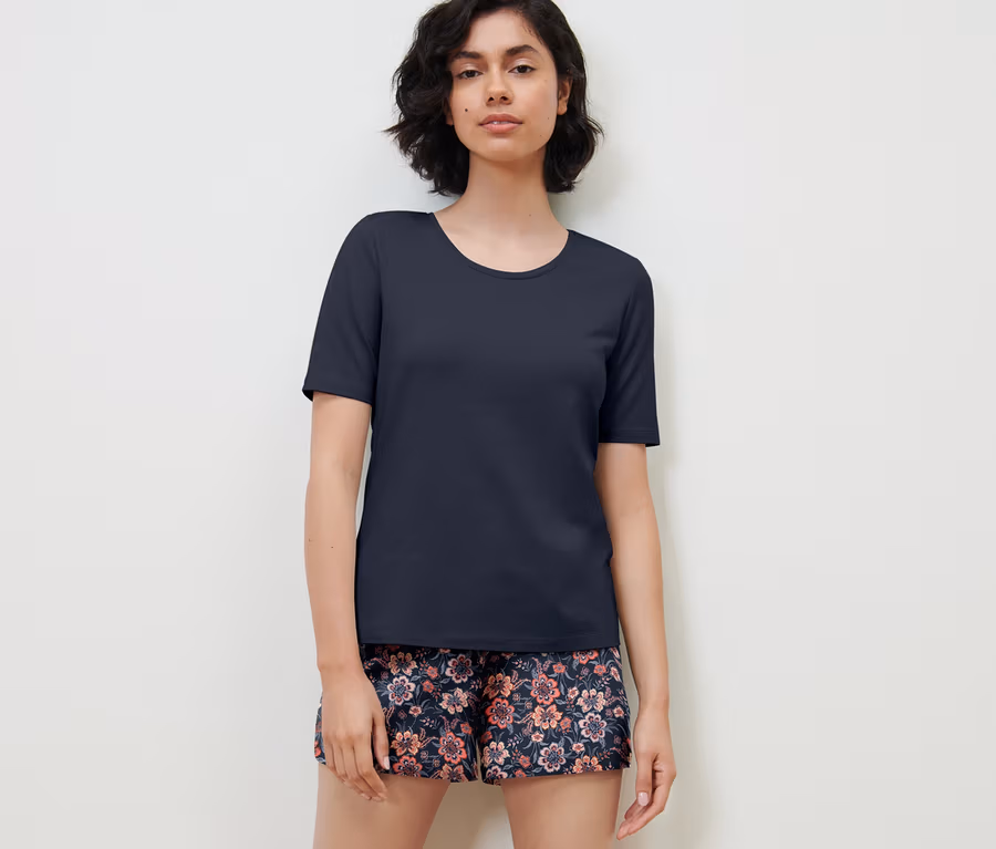 - Šortky: tmavě modrá s celoplošným květinovým potiskem v různých barvách