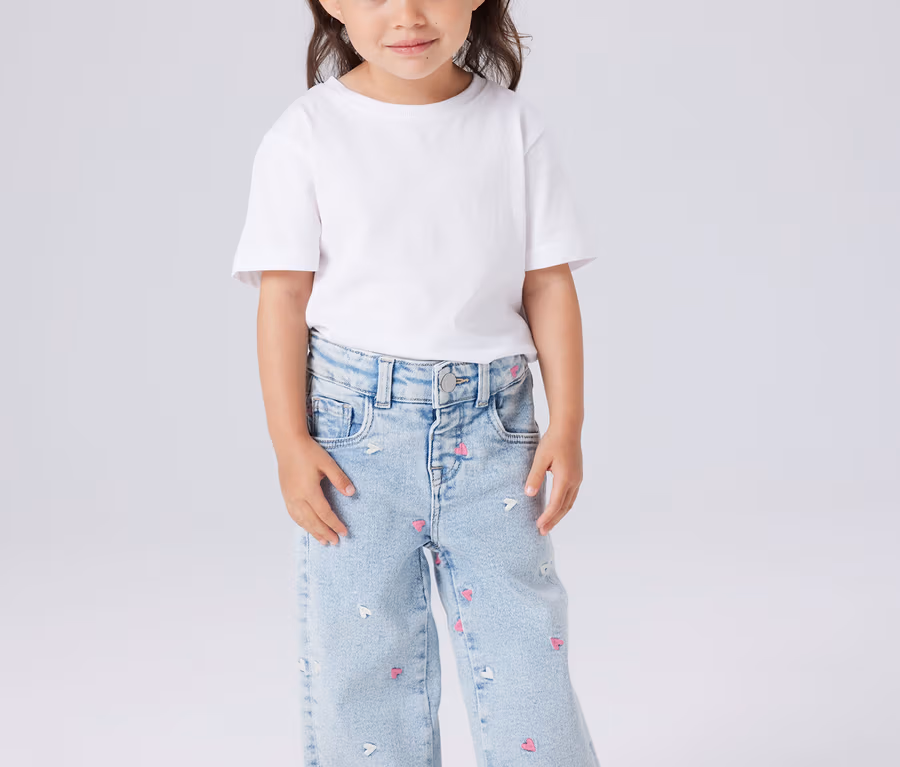 • Džíny s širokými nohavicemi a vyšívanými srdíčky