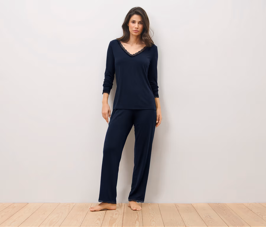 Pyžamová souprava s krajkovým lemováním, tmavě modrá