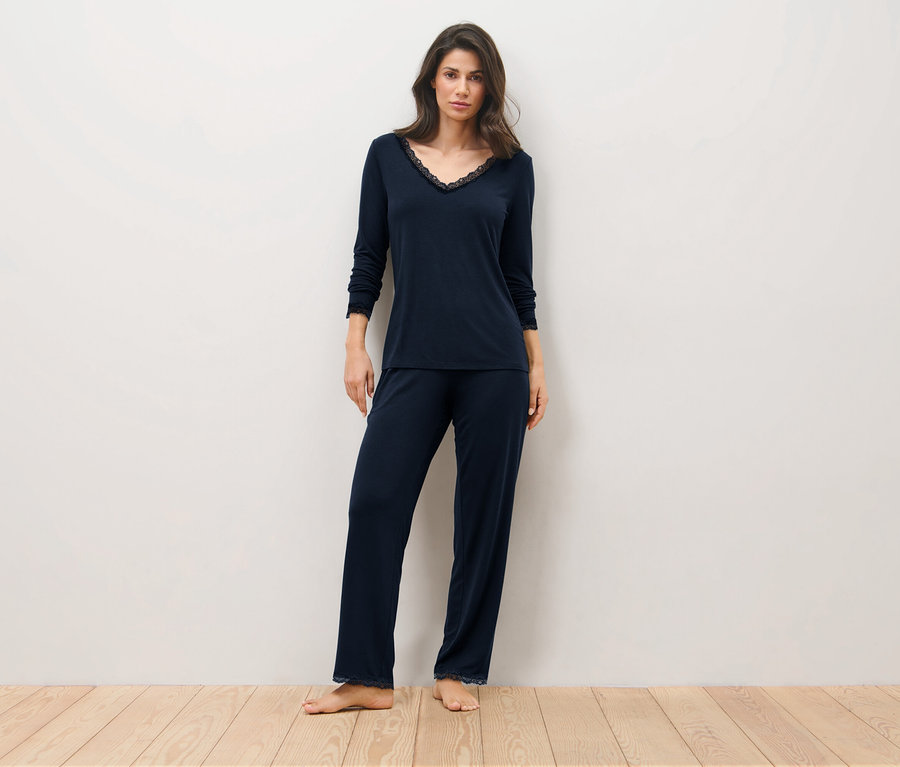 Pyžamová souprava s krajkovým lemováním, tmavě modrá