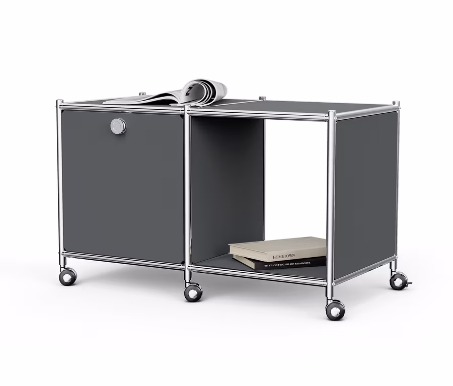 Kovový odkládací stolek »CN3« s 1 výklopnými dvířky a kolečky, šedá