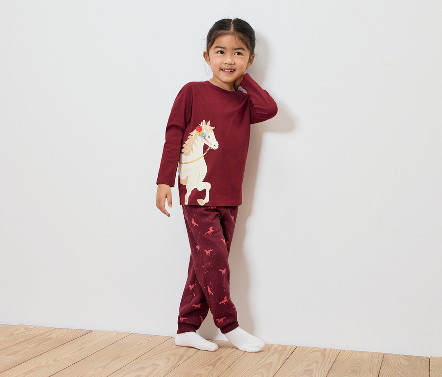 - Vínová červená s celoplošným potiskem koníčků ve světle červené barvě