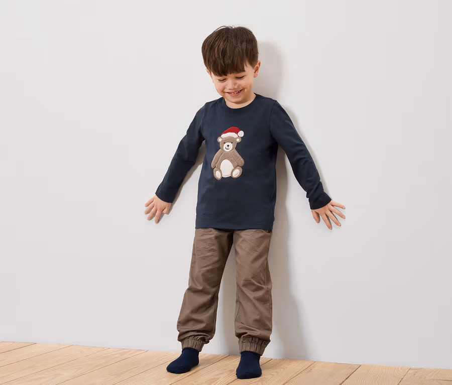 - 1x středně modrá s potiskem autíčka v různých barvách a sněhovými vločkami v bílé barvě, 1x tmavě modrá s aplikací medvídka v bílé a béžové barvě