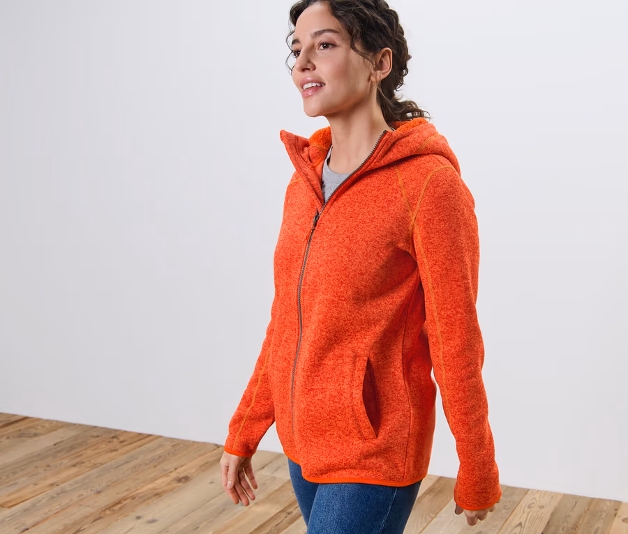 Bunda z pleteného fleecu s kapucí, oranžová s melírem