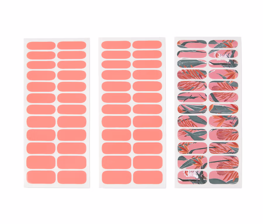 2 fólie, každá s 24x meruňkově růžovými nálepkami, 1 fólie s 24 nálepkami s barevným tropickým vzorem