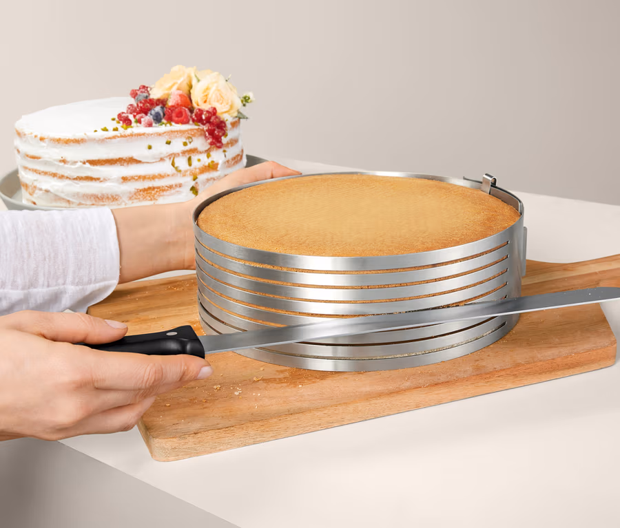 - Umožňuje snadno rozkrájet korpus s pomocí profesionálního nože na až 8 rovnoměrných plátů – perfektní např. na trendy vrstvené dorty