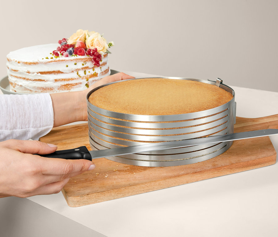 Každý, kdo touží po pečení trendy vrstvených dortů a dezertů, potřebuje i správné nástroje – jako je tato šablona na krájení dortových korpusů. Sada sestává z dortového kruhu na korpusy s průměrem 26 až 28 cm a z cukrářského nože. Tato profesionální sada umožňuje snadné rozkrájení korpusu na až 8 rovnoměrných plátů. S pomocí cukrářského nože s čepelí dlouhou 29 cm lze rozkrojit i ty nejkřehčí dortové korpusy. Nůž je navíc vhodný i ke glazování náročně zdobených dortů a moučníků. Takže pečení působivých, lahodných vrstvených dortů už nestojí vůbec nic v cestě.