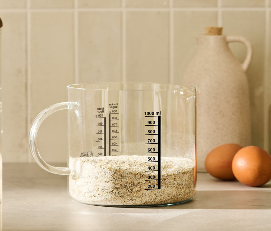 - Se stupnicí na tekutiny v ml a na cukr a mouku v g