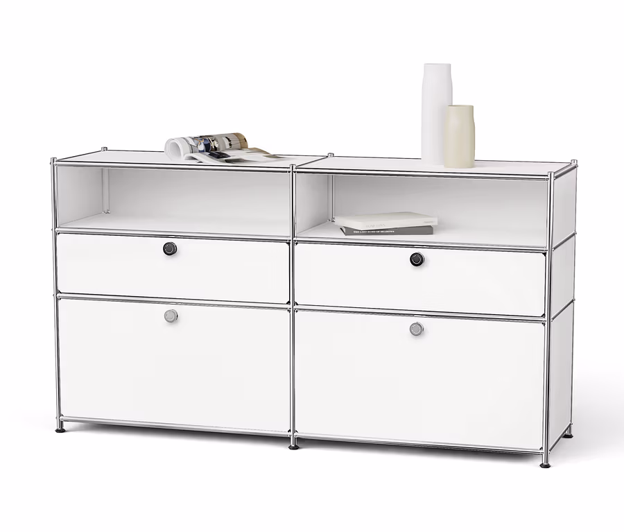 Kovová odkládací skříňka »CN3« se 2 výklopnými dvířky, 2 zásuvkami a 2 otevřenými přihrádkami, bílá