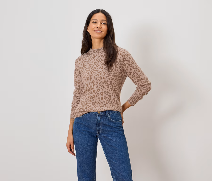 Pletený svetr se stojáčkem, béžová s melírem a celoplošným leopardím potiskem ve světle hnědé barvě
