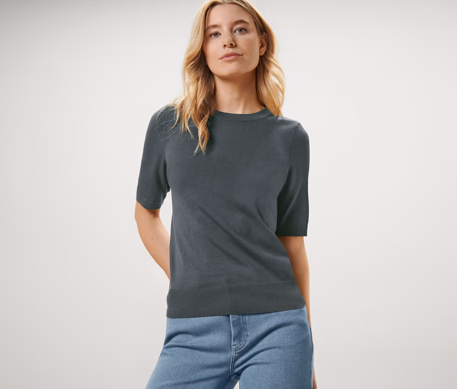 - Tento svetr z jemného úpletu obsahuje vlákna z udržitelného dřeva.