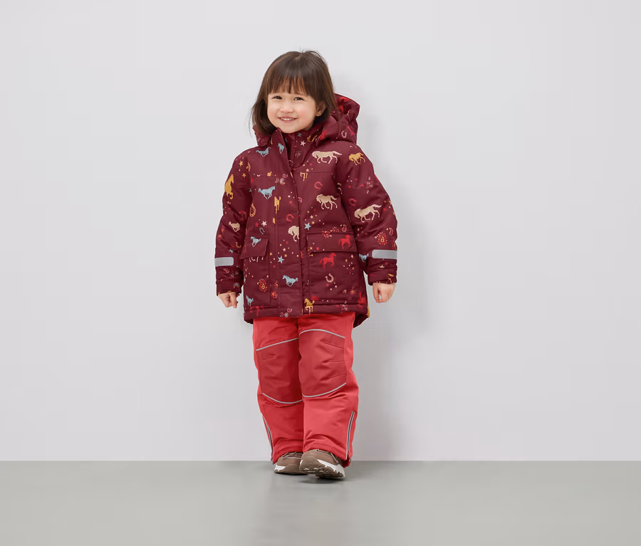 - Bunda: vínová červená s celoplošným potiskem koníčků v různých barvách a s podšívkou ve světle červené barvě