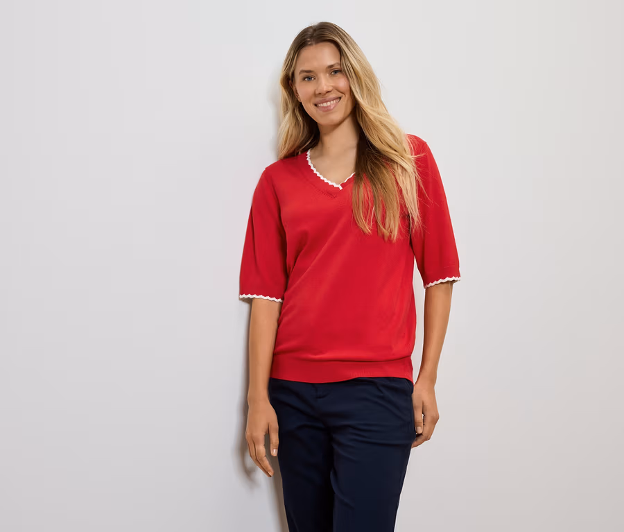 • Zvlněný lem v kontrastní barvě na výstřihu a na koncích rukávů