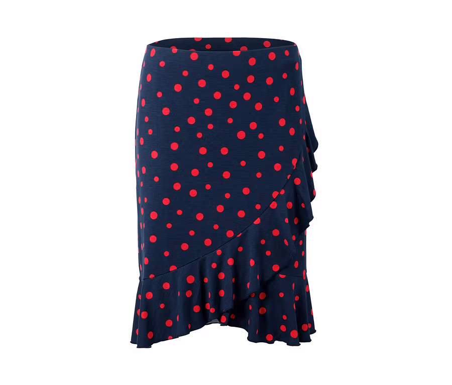 Stylová a hravá zároveň: tato žerzejová sukně v zavinovacím vzhledu se hodí ke každému lehkému letnímu outfitu a svými sytými barvami zajistí skutečný esprit. Sukně se střihem do A je vyrobená z příjemně měkkého materiálu s podílem viskózy. Díky obsahu elastanu navíc dobře drží tvar a výborně se nosí. Sukně má pohodlný elastický pas, takže perfektně sedí. Na spodním lemu je široký, nakládaný volán, který sukni dodává krásný optický akcent.