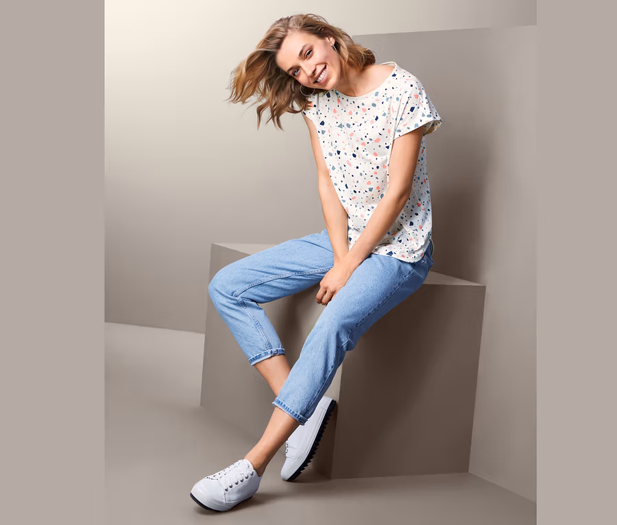 Cool doplněk k džínům nebo ke kalhotám culotte: toto dámské triko je úžasně módní kousek na léto. Moderní detaily, jako jsou spadlá ramena a kulatý výstřih, rukávy s přišitou ohrnutou manžetou nebo mírně prodloužený zadní díl, z něj činí ideálního průvodce na toulky městem nebo relaxaci na balkoně. Materiál je vyrobený převážně z biobavlny a modalu. Díky tomu je krásně měkký a příjemný na tělo.