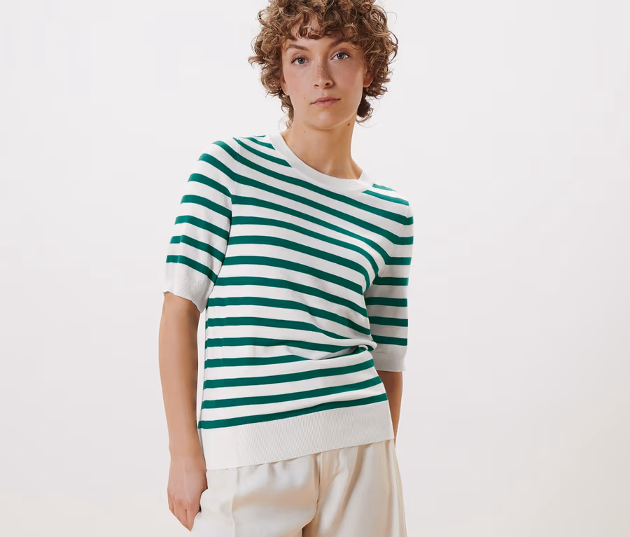 - Tento svetr z jemného úpletu obsahuje vlákna z udržitelného dřeva.