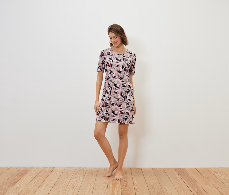 Celoplošný květinový potisk ve světle růžové a světle fialové barvě