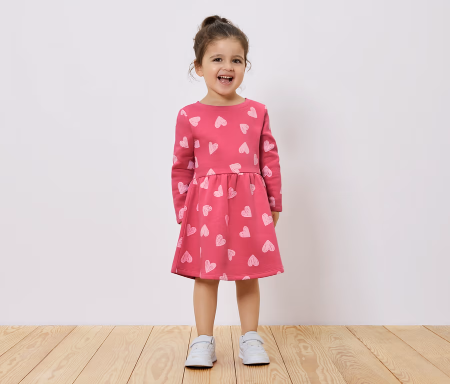 Dětské teplákové šaty, růžová s celoplošným potiskem srdíček ve světle růžové barvě
